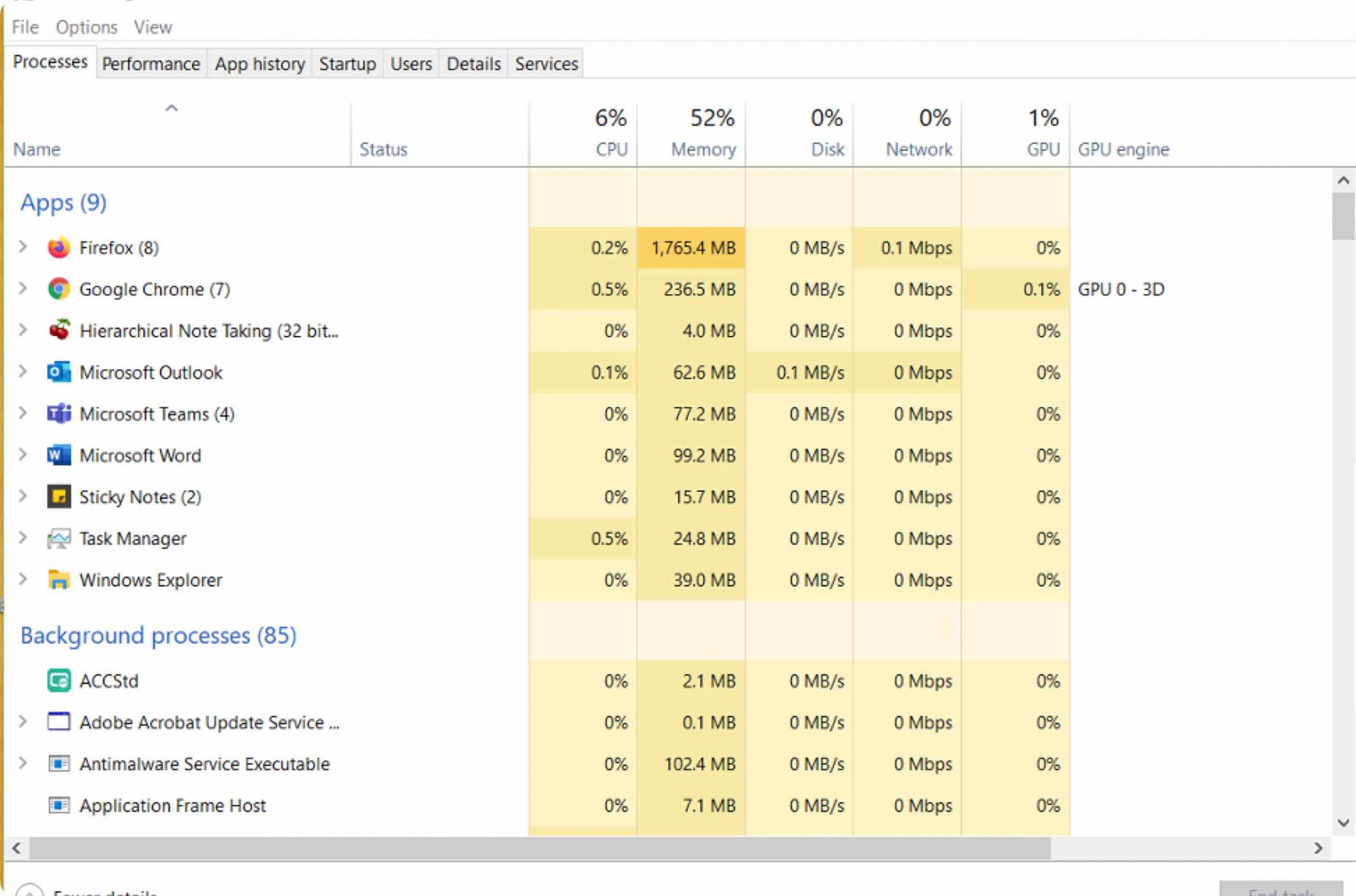 From this view in Task Manager, you will be able to see what’s taking up all your computer’s resources. Scan across where it says CPU, Memory, Disk, and Network. In Figure 3 above, the only thing taking a lot of resources is Firefox using half of my system memory. If nothing stands out, click on the CPU, Memory, Disk, and Network words and it will sort by that resource. For a graphical view of how resources are handled over time, you can select the Performance tab on the upper left, but come back to the Processes tab for the next step.